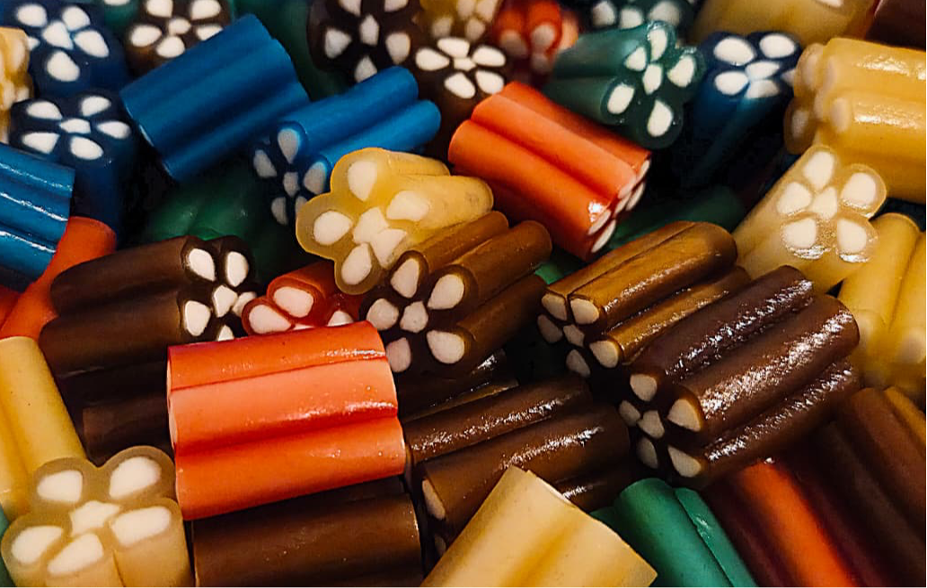 Ingrédients : sucre, sirop de glucose - fructose, eau, farine de BLÉ, amidon de maïs, dextrose, acidifiants : E270, E296, E330, graisse de palme, gélatine, correcteur d'acidité : E331, E325, arômes, sel, émulsifiant : E471, conservateur E202, colorants : E100, E120, E133, E150d. Agents d'enrobage : E901, E903, E904 Conserver dans un endroit frais et sec. Informations nutritionnelles (pour 100 g) Energie 1563 Kj - 368 Kcal Matières grasses 1,3 g dont Acides gras 0,6 g Glucides 87,3 g dont Sucres 66,8 g Protéines 1,7 g Sel 0,13 g